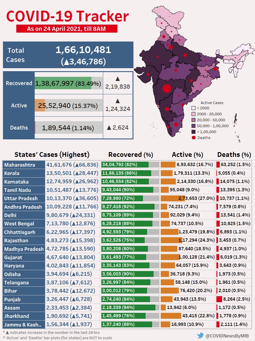 India saw a rise of 3,46,786 new cases and 2,624 deaths in the past 24 hours. With fresh fatalities, India's
